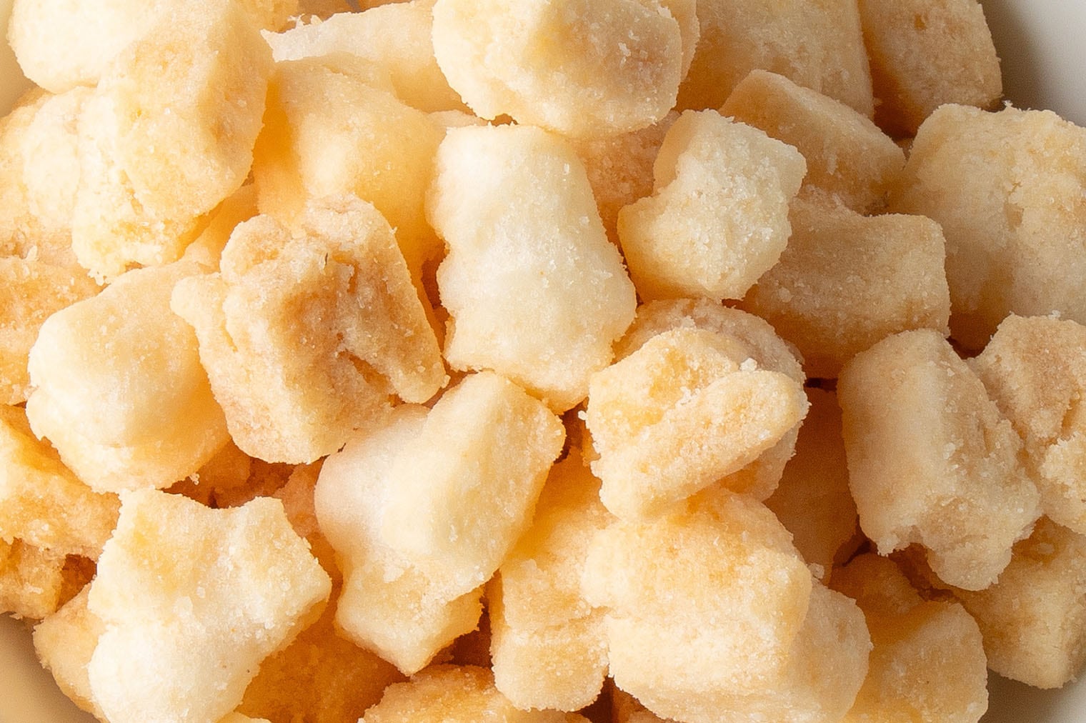| 原材料名 | 餅米(北海道産)、植物油脂、粉糖、食塩、チーズパウダー、デキストリン、バターミルクパウダー、乳等を主要原料とする食品、たん白加水分解物、酵母エキスパウダー/調味料(アミノ酸等)、香料、微粒二酸化ケイ素、(一部に乳成分・大豆・小麦を含む) |
