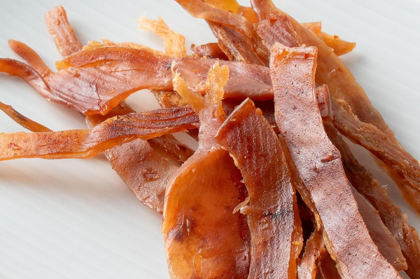北海道近海で漁獲された新鮮なスルメイカを、皮付きのまま香ばしく焼き上げ、やわらかく裂いて仕上げた、風味豊かなおつまみです。