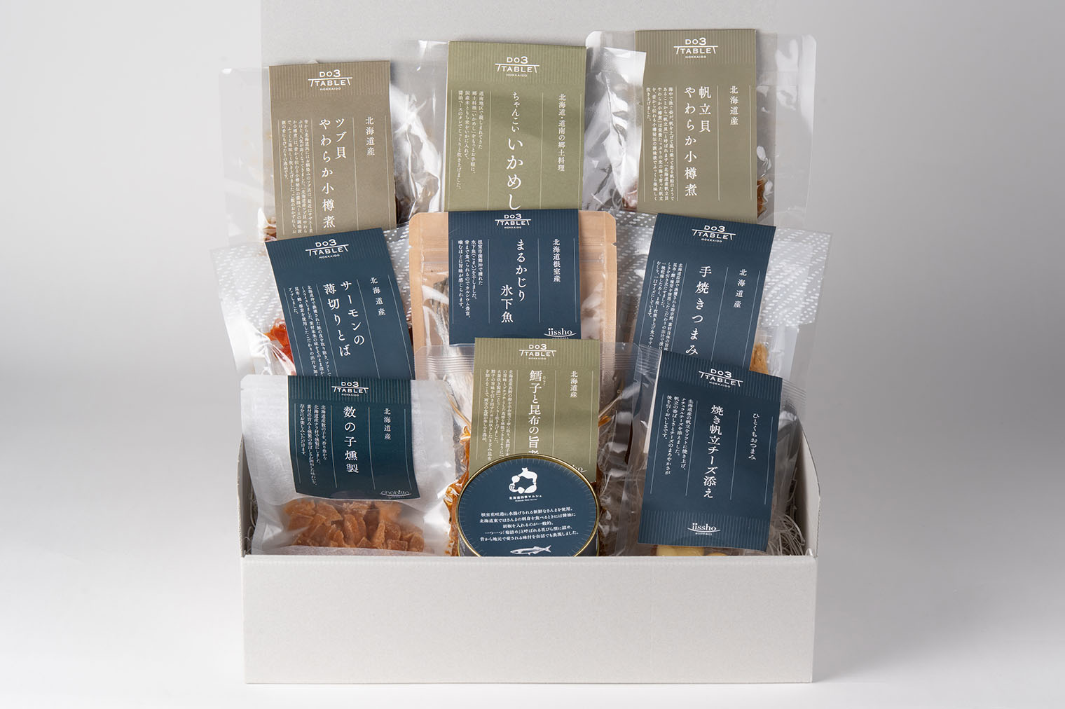 海鮮珍味や昆布巻き、いかめしなどおつまみに限らず、酒の肴にぴったりな北海道の海の幸を使用した商品を集めました。日本酒やビールはもちろん、ウイスキー、ワインにも合うセットです。
